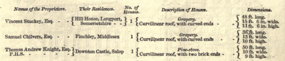 Knight writes about his ideas for growing pineapples in a chapter in this book but as his hot-house (which he describes as 40ft long by 12ft wide) did not have the benefit of the latest glasshouse technology i.e. "a curved iron-roof such as those erected by Mr. Loudon” [see Note 9 again], he deferred purchasing plants until the following spring (1819) when he hoped his new hot-house would be in place. Such a curvilinear roof would be superior, he wrote, and give such advantages as being cheaper to erect, more durable, require less expense in painting it, and admit much more light.
